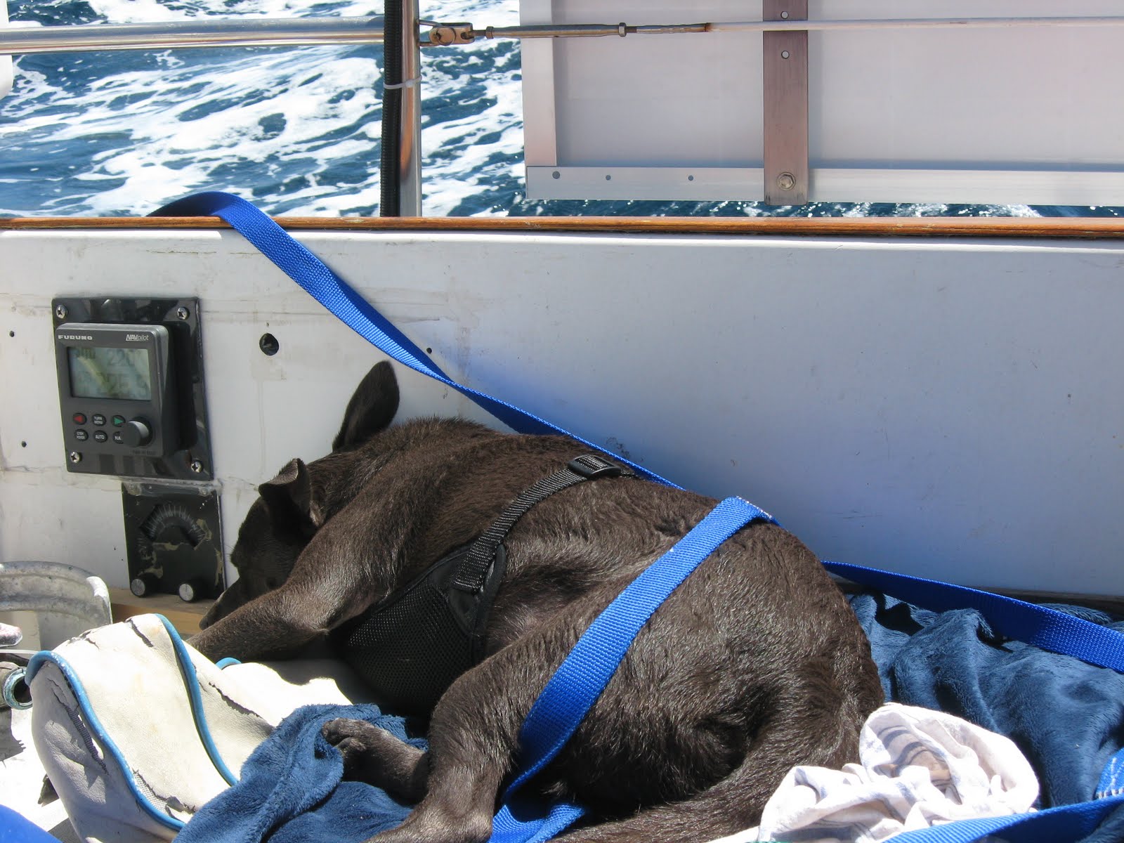 This picture sums up our mood on the next leg to Banderas Bay. Seas are rough. There is not enough wind to sail for the first five hours and we are forced by rum line to be riding in the trough. Everybody is a wee bit sea sick. The sun is also pounding on us, and poor Dover is just a little black sun sponge!